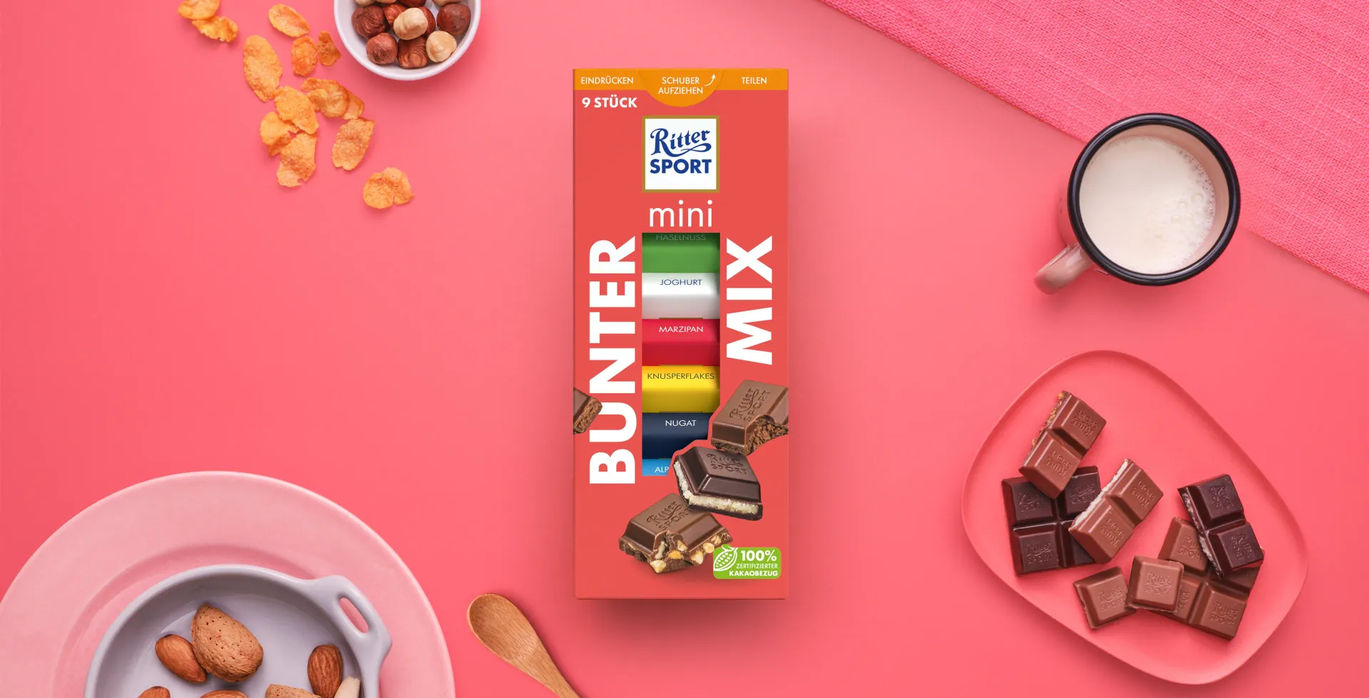 Geschmäcker sind bekanntlich verschieden. Wir hoffen, das trifft auch auf deine Freunde und Familie zu - denn dann wird es besonders viel Spaß machen, den Bunten Mix zu teilen. Ob knusprig, cremig, nussig oder doch lieber pur: Bei unseren sechs leckeren Sorten ist für jeden was dabei. Das geben wir dir gerne schwarz auf weiß. Oder in diesem Fall bunt auf Rot.