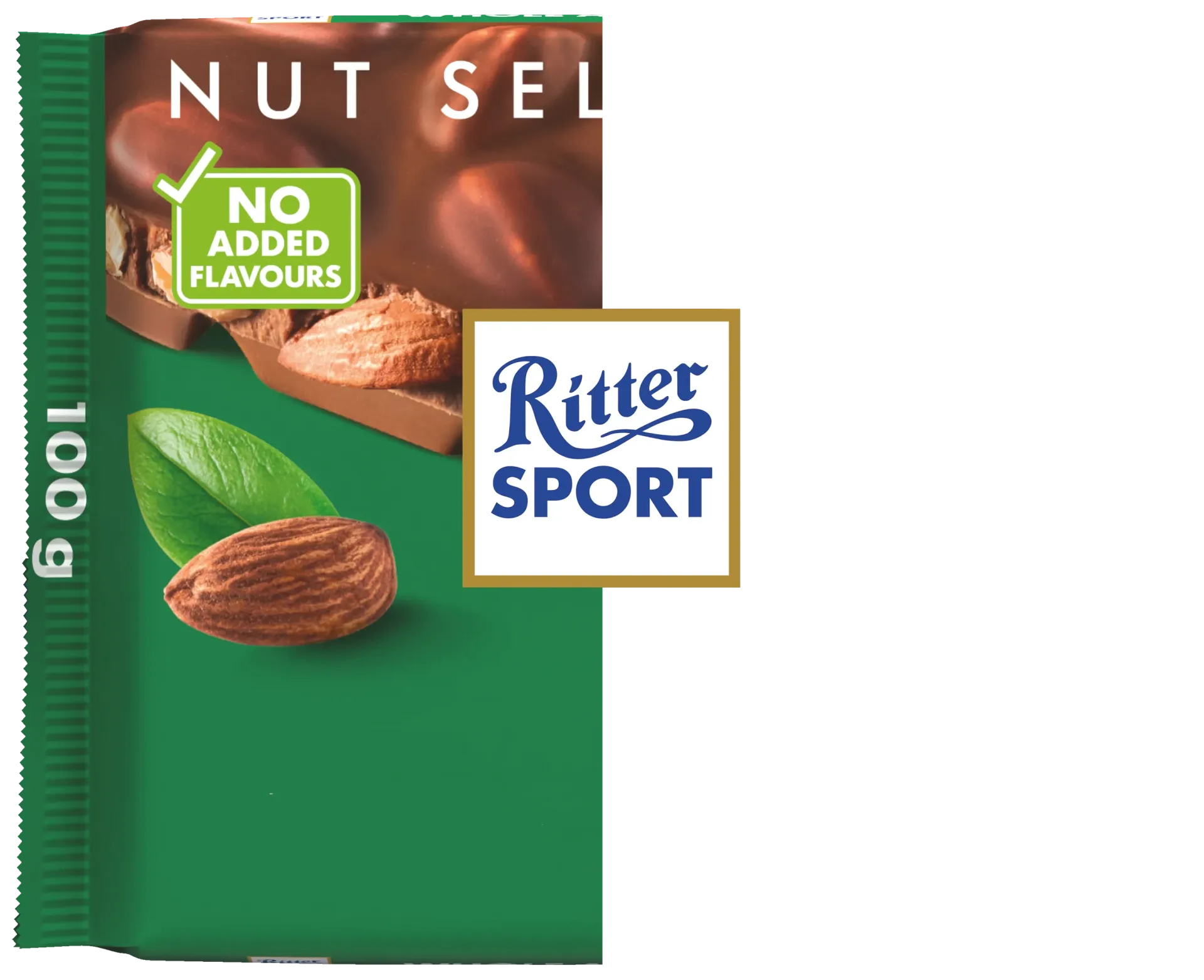 You'll have a cracking good time with RITTER SPORT Whole Almonds. Here we go with hand-picked, crunchy roasted Californian almonds in classic milk chocolate. Though for the same reason we can't promise that you'll enjoy the bar in peace.
